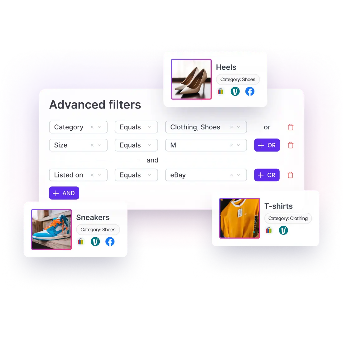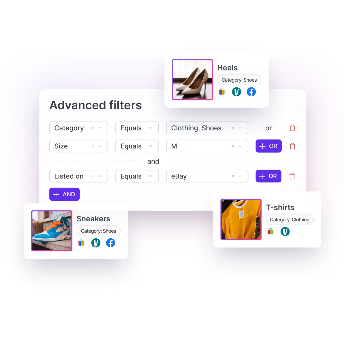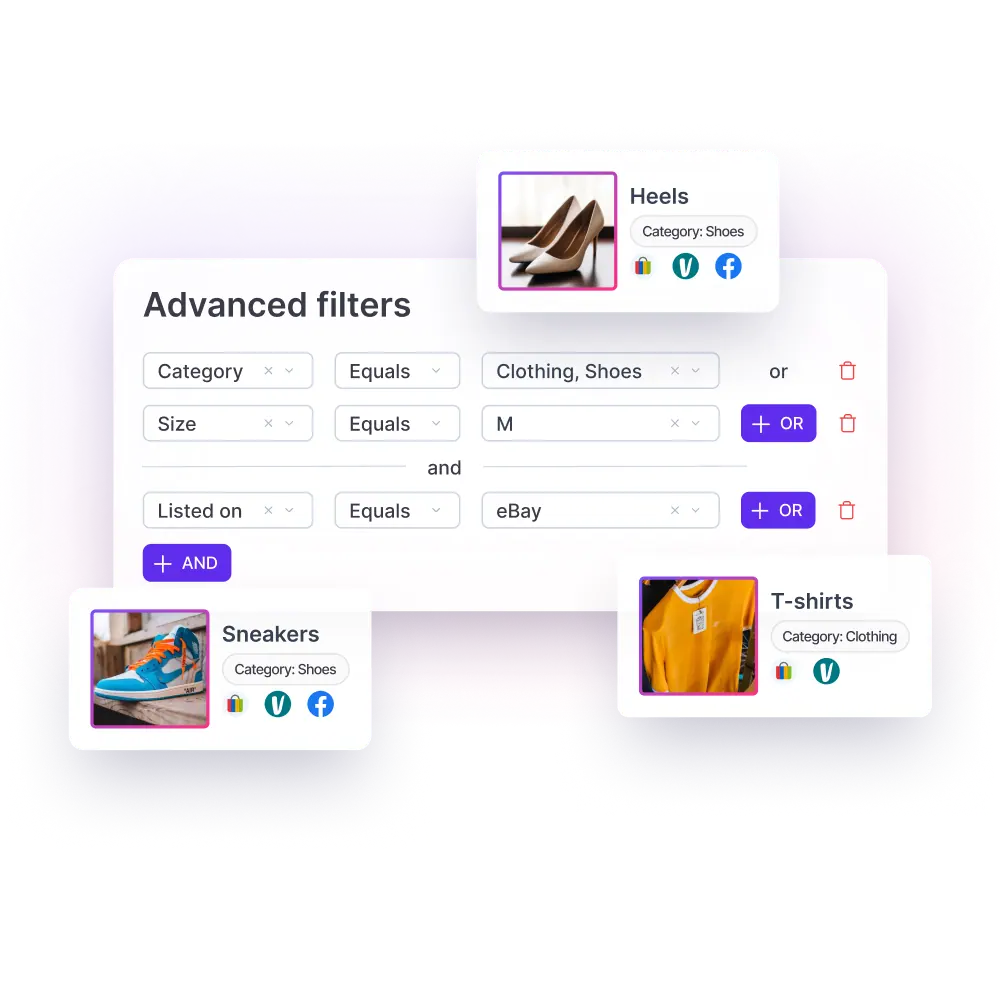 Crosslist® lets you organize thousands of listings with custom labels, advanced filters, dynamic columns and flexible sorting so you can find any item in seconds. Use powerful AND/OR filters to segment your inventory, save personalized views and switch between layouts instantly. Stay fully in control across all marketplaces and always know what to relist, discount or promote.